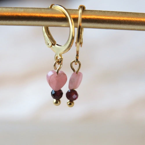 Goudkleurige Huggie oorbellen - 'Aura' - Rhodoniet & Granaat