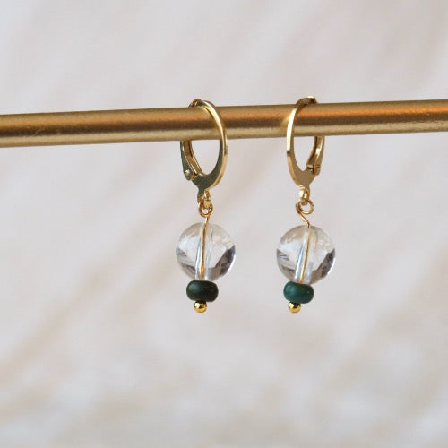 Goudkleurige Huggie oorbellen - 'Forrest' - Bergkristal & Turkoois