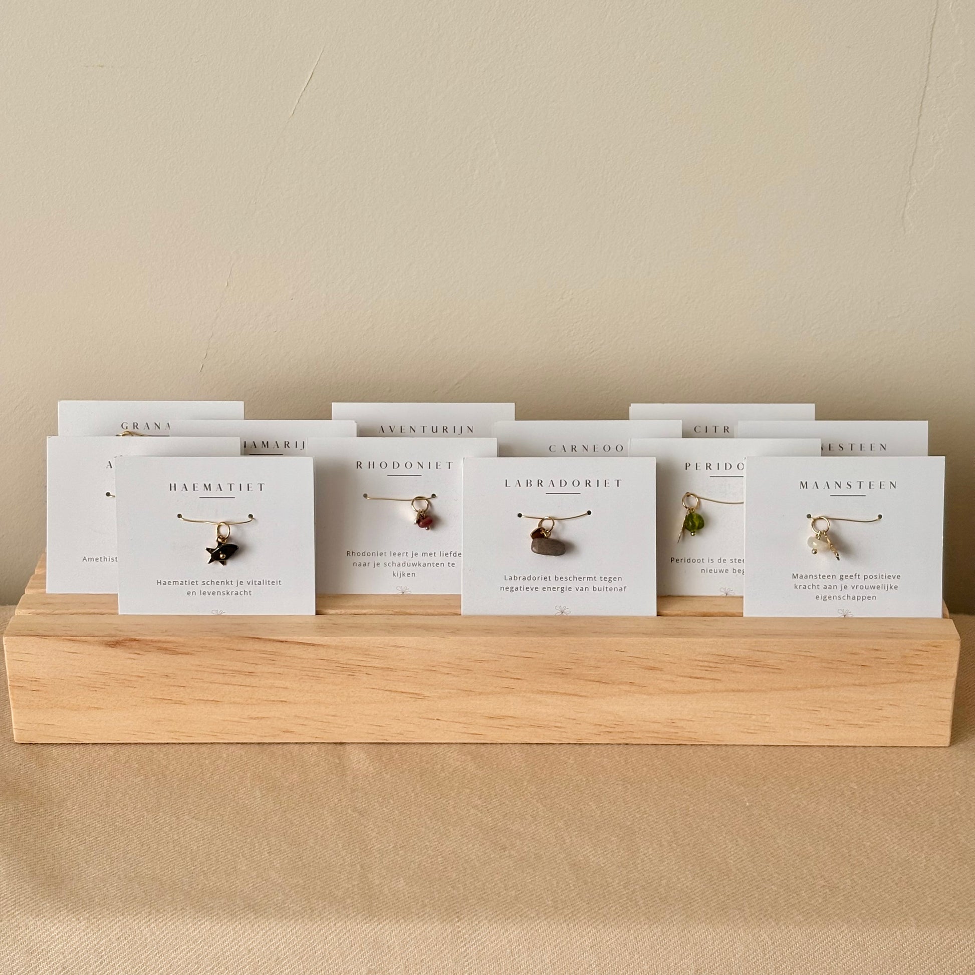 De bedel hangers worden geleverd als verkoopklare sieraden. Gepresenteerd op een mooi kaartje met de werking van de edelsteen.